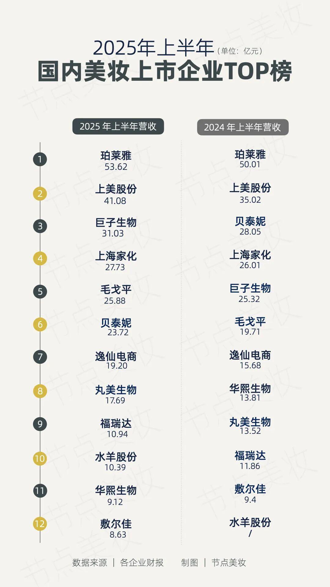 巨子生物则以31.03亿元营收从去年同期第五跃居第三,毛戈平以31.3%的同比增幅从第六跃居第五,有望在年内突破50亿大关。上海家化稳稳守住第四席位,营收27.73亿元。